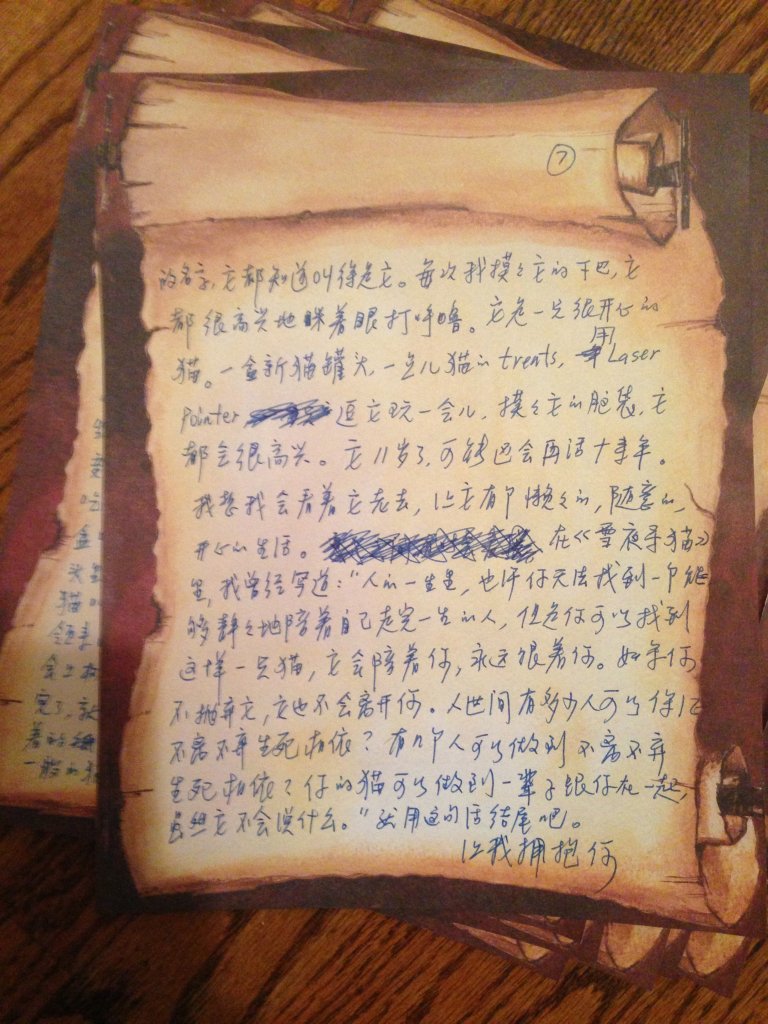 读了凡心的爱猫, 很感动啊!这不是拥抱第二, 拥抱妹吗? ! 就爱猫而言啊。拥抱哥这份手稿看上去行云流水,十分赏心悦目。手稿纸优雅、字体洒脱,有点浪漫主义的风格。这文写得真好,我很喜欢。拥抱哥说睡觉时,猫咪喜欢跳到床上来,我家的也是,一开始,我曾试图赶它下床,可是当看到它那一副可怜相,我只好缴枪投降,任凭它来霸占我的床。每天早晨醒来,总会发现它懒洋洋地躺着身边,有意无意的,身体会有一个地方与我接触着。毛茸茸的小肚子,深深的吸气,轻轻的呼气。我总会忍不住在它身上轻抚一把再起床。而它,会懒散的打个深深的哈欠,用夸张的动作,伸个长长的懒腰。好像在说“我也起床了...”梳洗的时候,它会守候在洗手盘旁边张望着我,不时一上一下的跳跃,每天如此,非常地执着。