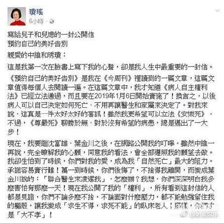 前段时间看新闻说琼瑶公布遗书““明年将迈入80岁的琼瑶突然公开一封写给儿子的信,透露她近来看到的《预约自己的美好告别》文章,有感而发想到自己的身后事,叮咛万一到了该离开之际,不需要各种急救措施,只要让她没痛苦地死去就好。另外身后事无须用任何宗教的方式悼念,盼一切从简。”