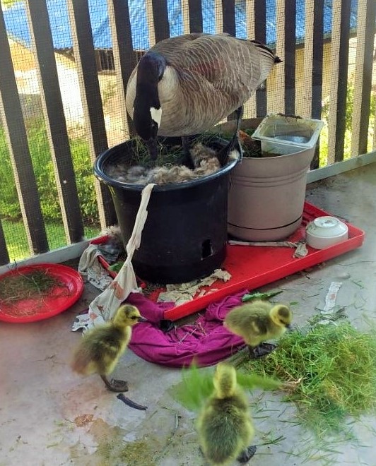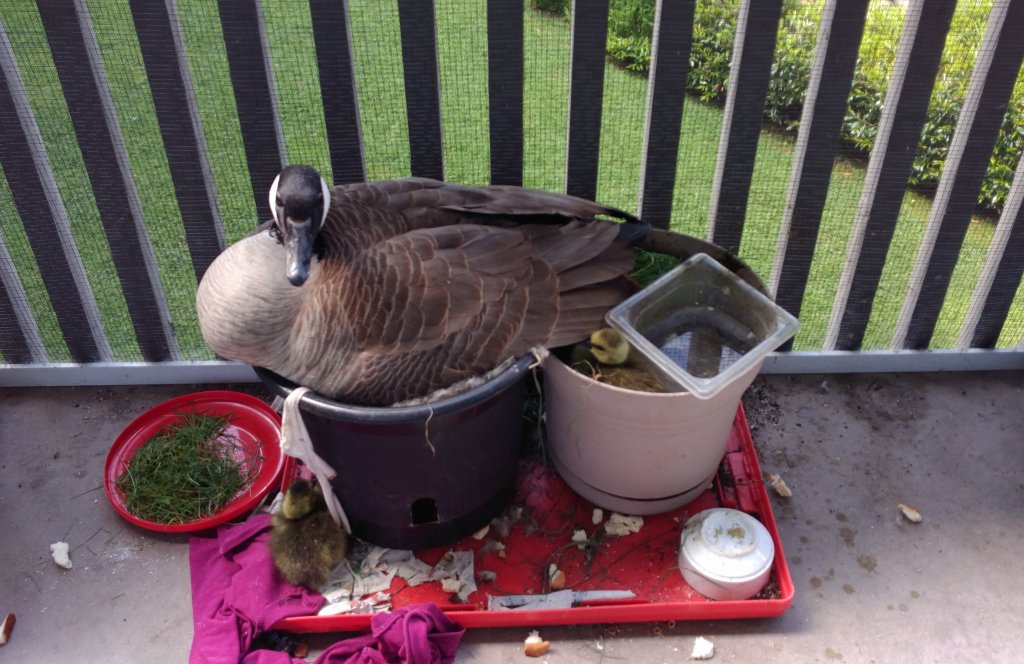 阿美和阿大都不知道要怎样离开这个阳台,一开始他们看中了这里僻静又安全,可是正楼下是铺的石头,远一点才是草坪,雁宝宝跳下去肯定受伤。所以才不得不把阳台的每个缝隙都给堵住。这是大雁们无法预见到的问题,据说有大雁在9层楼的屋顶上孵蛋的,那是真没辙了,只能叫wildlife rescue 的专业人士上去救助。