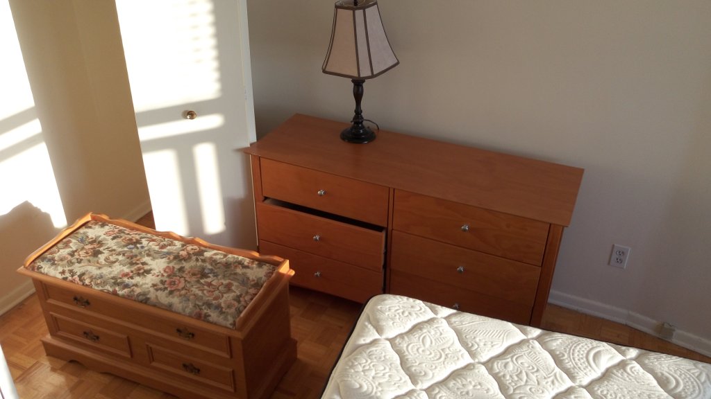 3.棕色Double sized的床加床垫。$260. 棕色实木桌子。$30。黑色椅子 $15