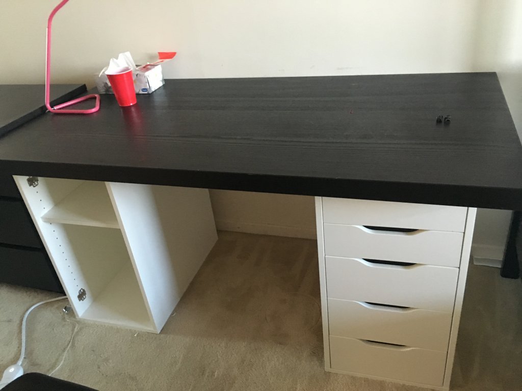 一个超大写字桌原价150+刀,现在80刀。一个三层的黑色木制柜子原价60刀,现价40刀。两个一起150刀全拿走!