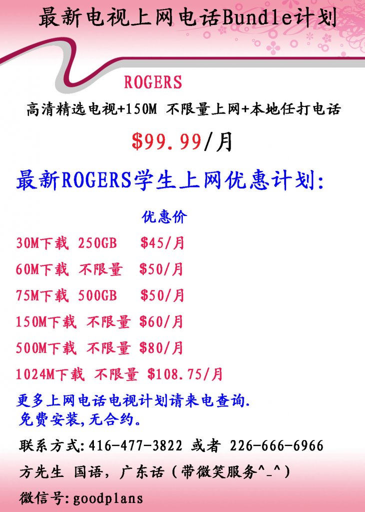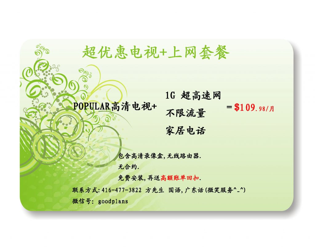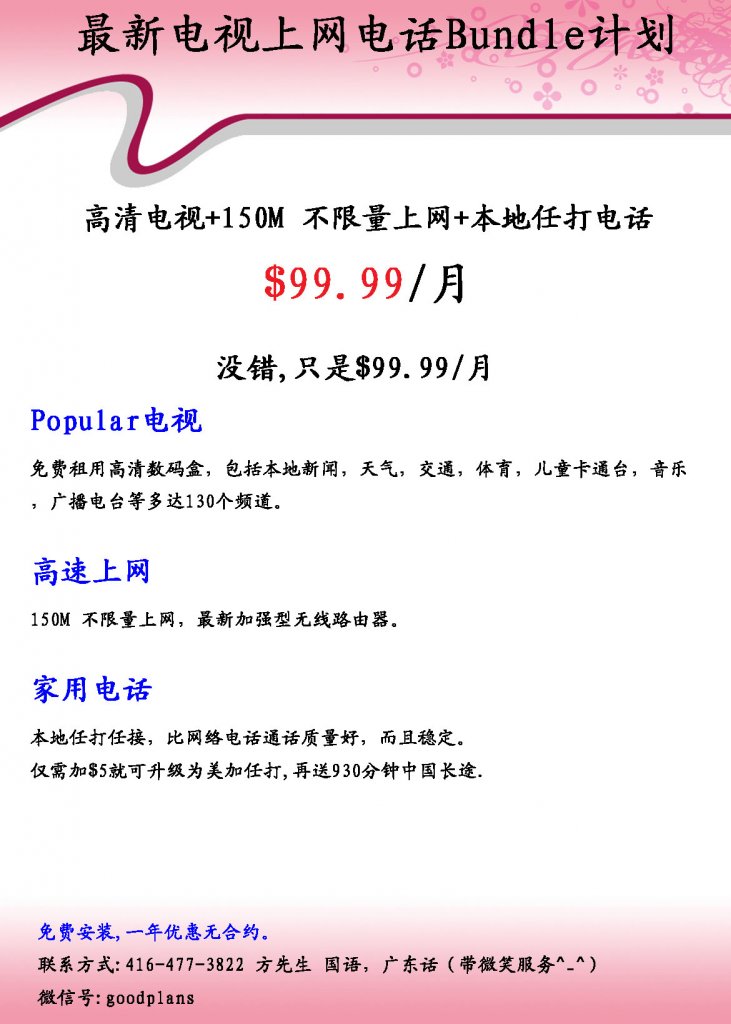 方先生 416-477-3822 服务华人社区15年,国语,广东话,英文服务---上网, 电视,电话一条龙.(并非代理商,可以提供更多更好更放心的服务)