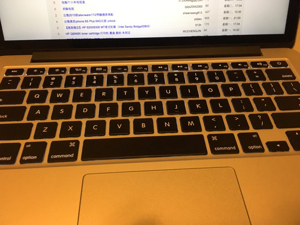 9月的时候购入的macbook pro 13 i5 128g,因为最近不小心把果汁倒入键盘(修了150,店主说键盘架被腐蚀了),导致键盘变得生硬,但机内硬件不受影响(苹果店检查过,如有需要的话买之前也可以到苹果店检查),修的话要600(键盘与机壳一体设计,所以要一起换,当然水的话由于一体设计也不会到达下一层)。