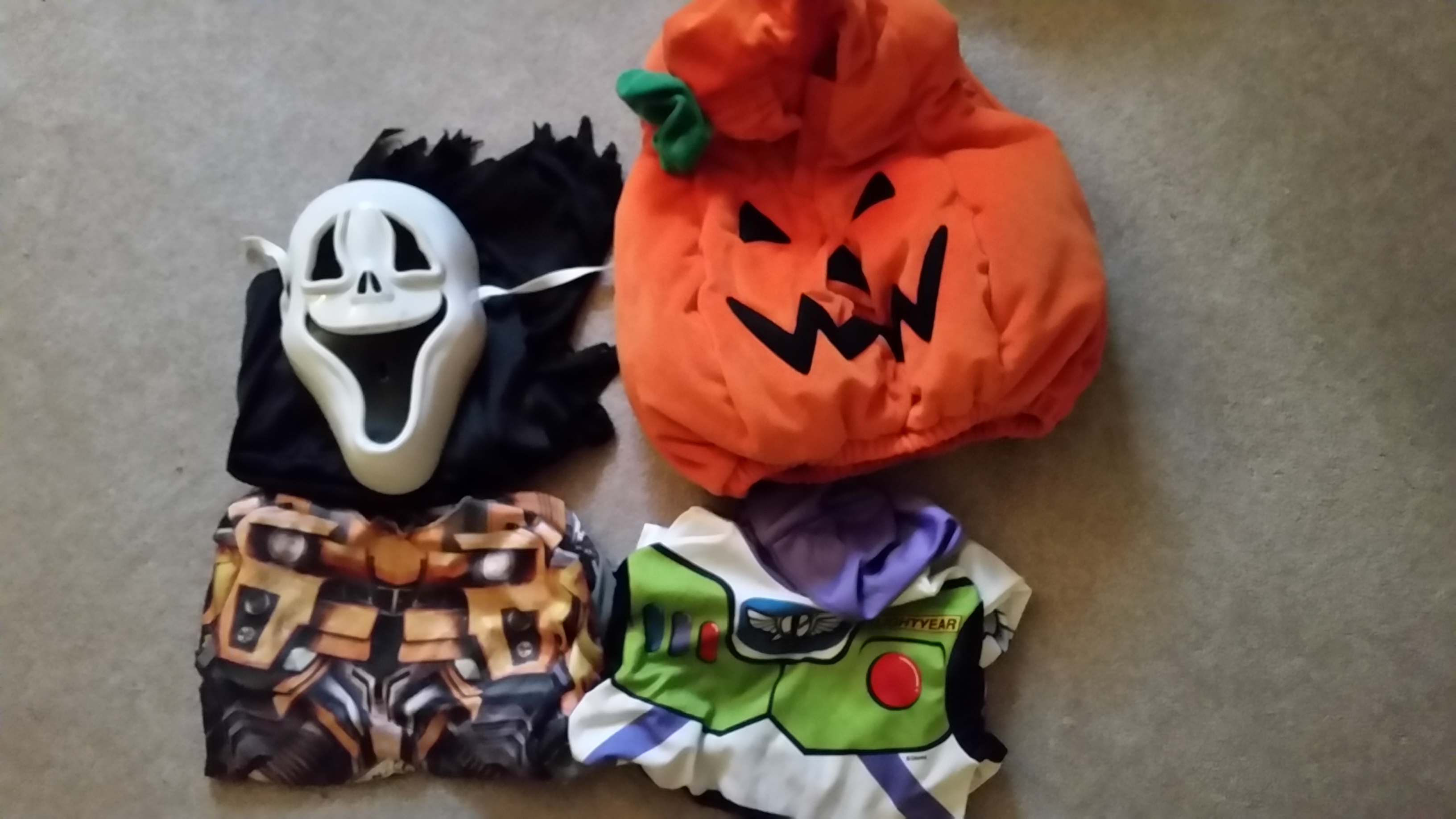 男孩万圣节costumes: Pumpkin: 6 months up Buzzlightear: 3 yr up Bumblebee: 4 yr up Ghost with mask: 7 yr up $5.00 each