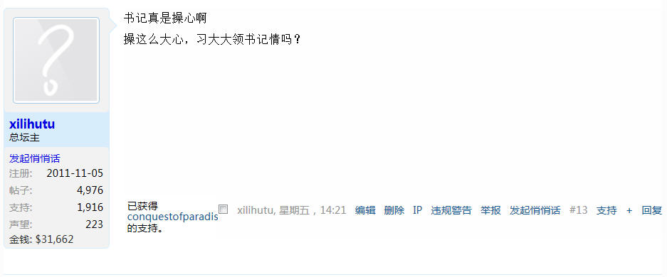heureux 说: 再看看这个贴子,讨论得好好的,不小心又被咬了一口: http://bbs.comefromchina.com/threads/1558746/ 浏览附件654947 点击展开... 书记,好好的讨论,您老怎么咬上了? 公众论坛,您老建楼,我添砖加瓦没骂您老吧,您老为神马动粗啊? 再说了,与这个楼也没关系啊? 现在祖国形式大好,在习宽衣带领下摞起袖子干起来,书记有啥不开心的,四处骂人呀?