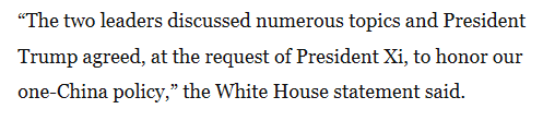 “The two leaders discussed numerous topics and President Trump agreed, at the request of President Xi, to honor our One China policy,” the White House said in a statement released late Thursday night. It said the discussion was “extremely cordial” and that the presidents “extended invitations to meet in their respective countries.”