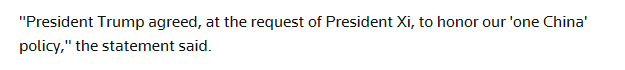 A White House statement confirmed a Thursday night report that President Donald Trump had agreed to honor China's "One China" policy in his first call with the country's president.