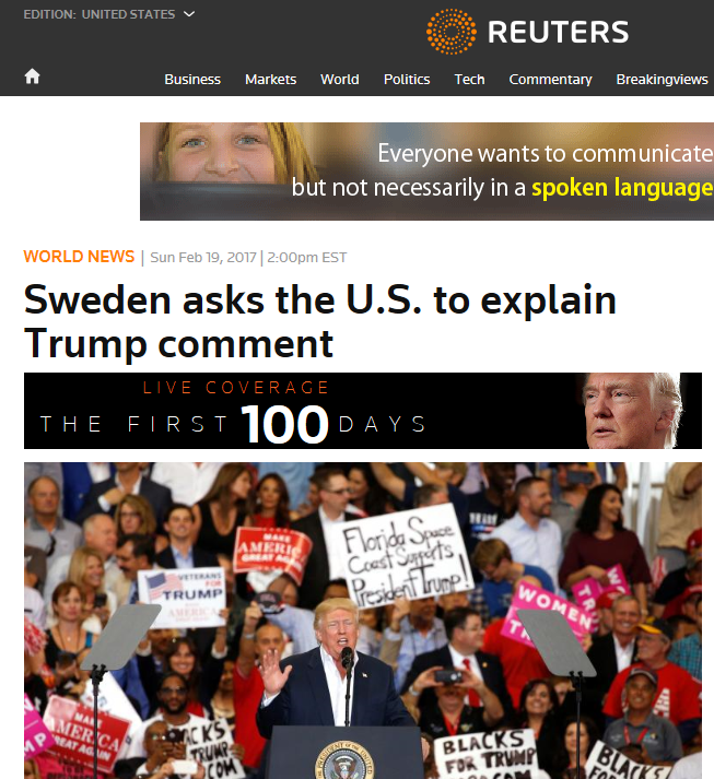 Former Swedish foreign minister Carl Bildt tweeted, "Sweden? Terror attack? What has he been smoking? Questions abound." 向问天 说: 浏览附件664013 点击展开...