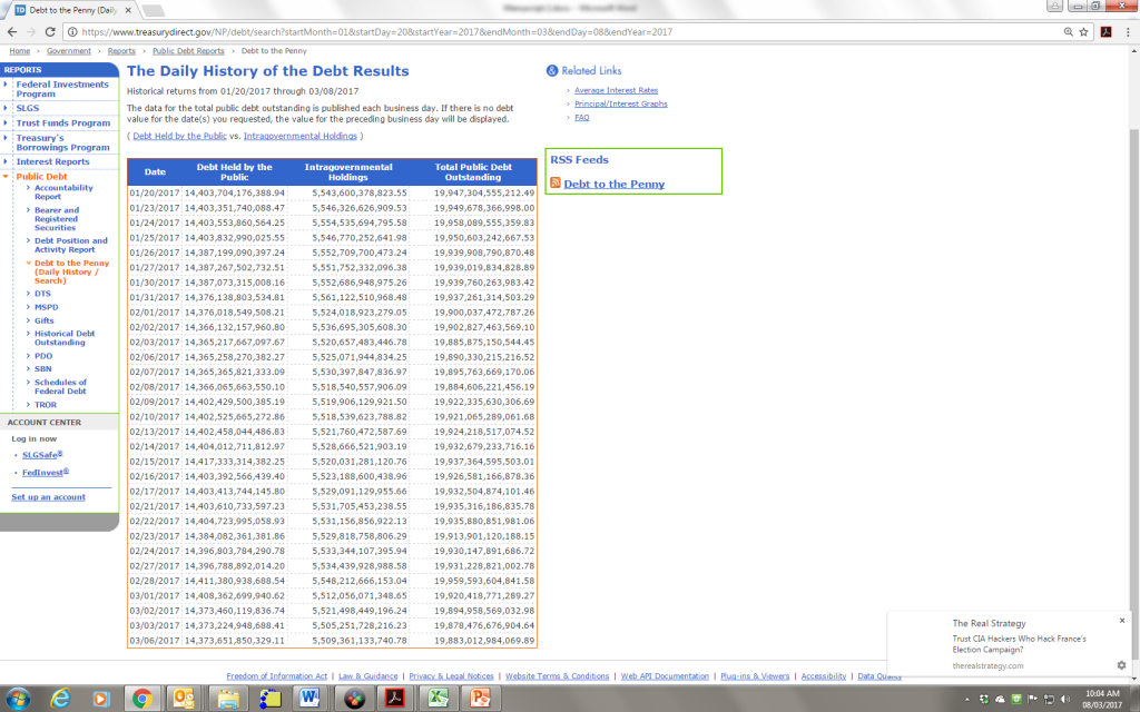 ccc 难得糊涂 管理成员 VIP 注册 2003-04-13 消息 238,117 荣誉分数 37,486 声望点数 1,393 2017-03-08 #25 明的凡 说: U.S. Debt Was $19,947,304,555,212 On Jan. 20th… You’ll Be Stunned At Where It Is Now (link: http://thetruthdivision.com/2017/02/u-s-debt-19947304555212-jan-20th-youll-stunned-now/) thetruthdivision.com/2017/02/u-s-de… #trump #pray4DJT #GodblessUSA 点击展开... 每月减120亿($12 billion),一年就是1440个亿($144 billion);国债$19,935,316,186,835.70,按这个速度,不计利息,美国仍需要140年才能消灭赤字。 我算得对么? 最后编辑: 2017-03-08