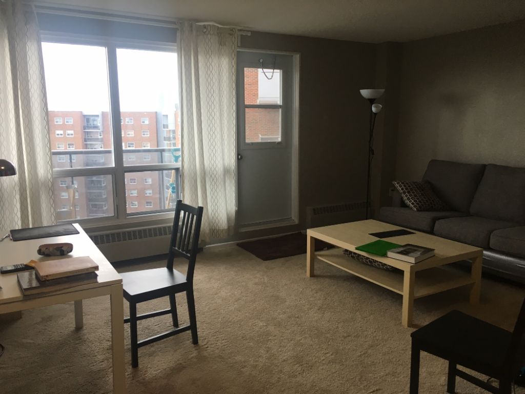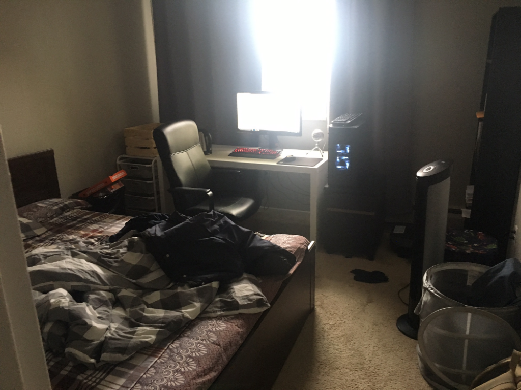 房间一到两个人住完全够 卧室摆得下Queen 的床和一张桌子 椅子 还有一面墙的大衣柜 一大一小两个储物间 客厅我放了3座沙发(可出售,买了一年不到)还有6人餐桌 以及茶几