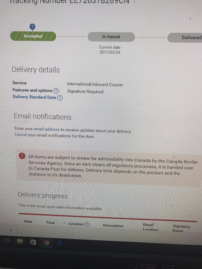 父母从国内寄了一个包裹来加拿大, 16寄出,到今天24号,物流信息一直没有更新, 一直显示在前往加拿大的路上。 8天了,怎么着都到温哥华海关了吧。现在根本不知道包裹的情况,就算被扣了,起码给个消息啊。奇怪的是,我查了Canada post, 上面显示收到我的包裹,然而迟迟没动静。现在除了等还有什么办法,等没问题,受不了这种什么都查不到的感觉。