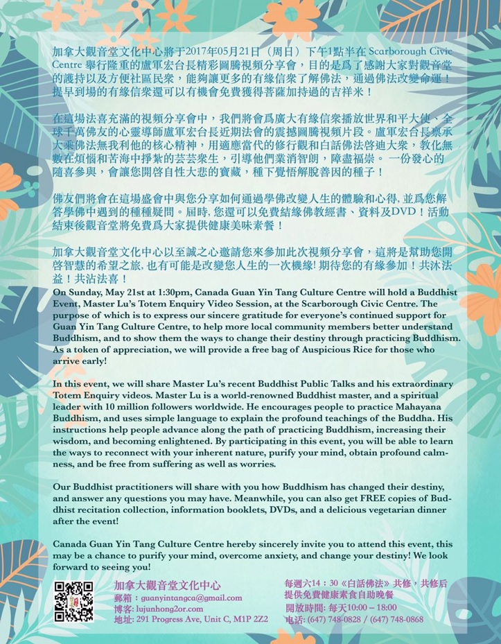 加拿大观音堂文化中心以至诚之心邀请您来参加本次活动,共沾法喜!