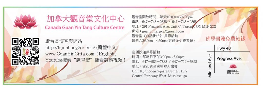 加拿大观音堂文化中心:免费结缘经文和佛学书籍, 周六免费共修素餐; 地址: 291 Progress Ave, Unit C, Toronto, ON, M1P 2Z2 (Progress Ave/Midland Ave.东南角)