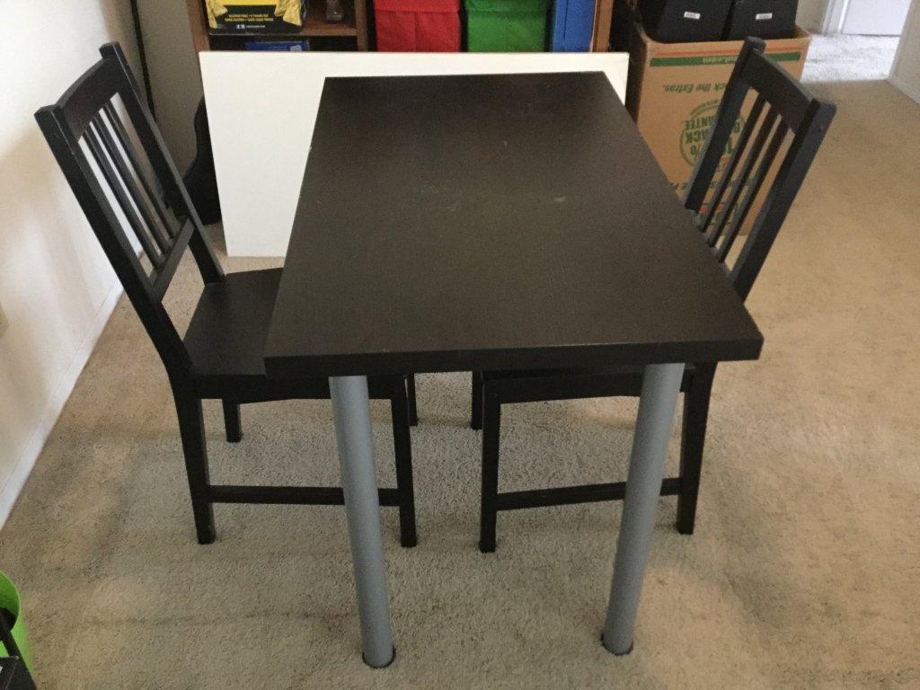一个黑色宜家桌子 两个宜家椅子 一共十块钱, 一个转椅免费送。