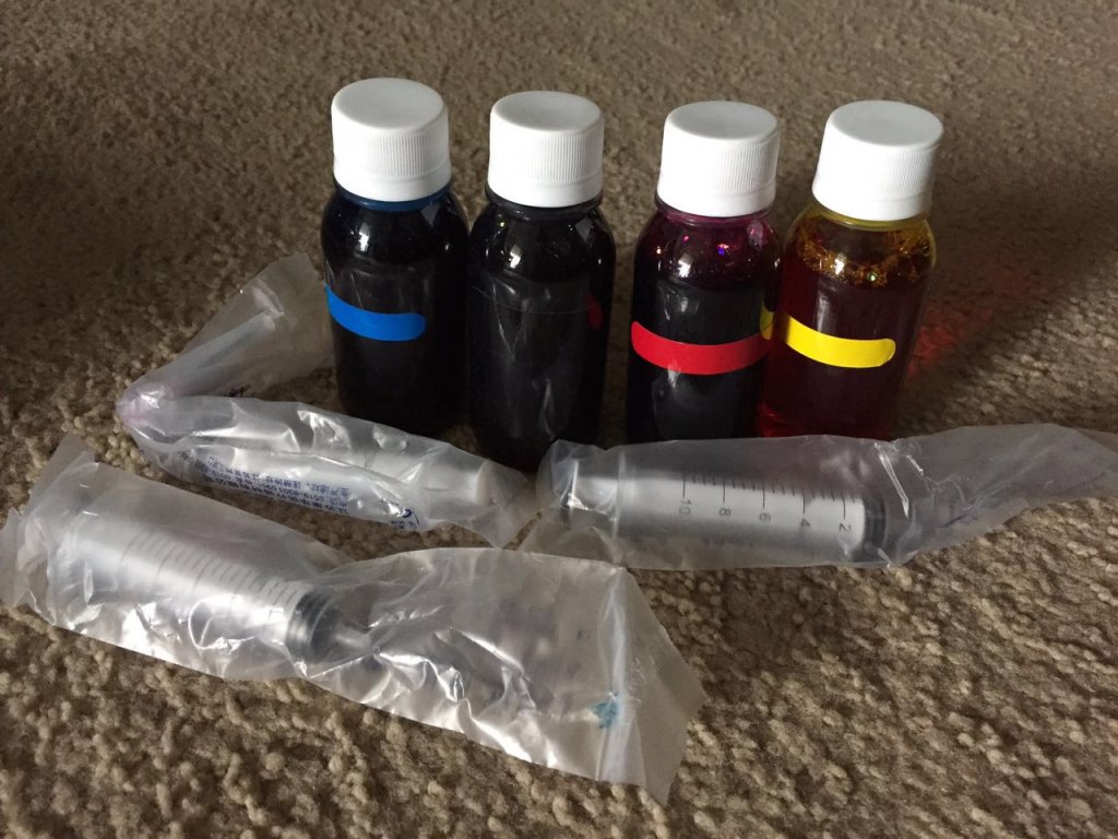 1. 打印机手动注墨的墨水以及针筒,黑色,蓝色,红色,黄色各一瓶。$ 10