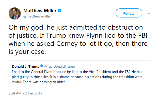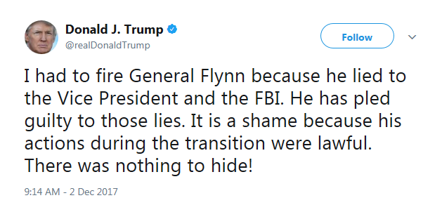 I had to fire General Flynn because he lied to the Vice President and the FBI. He has pled guilty to those lies. It is a shame because his actions during the transition were lawful. There was nothing to hide!