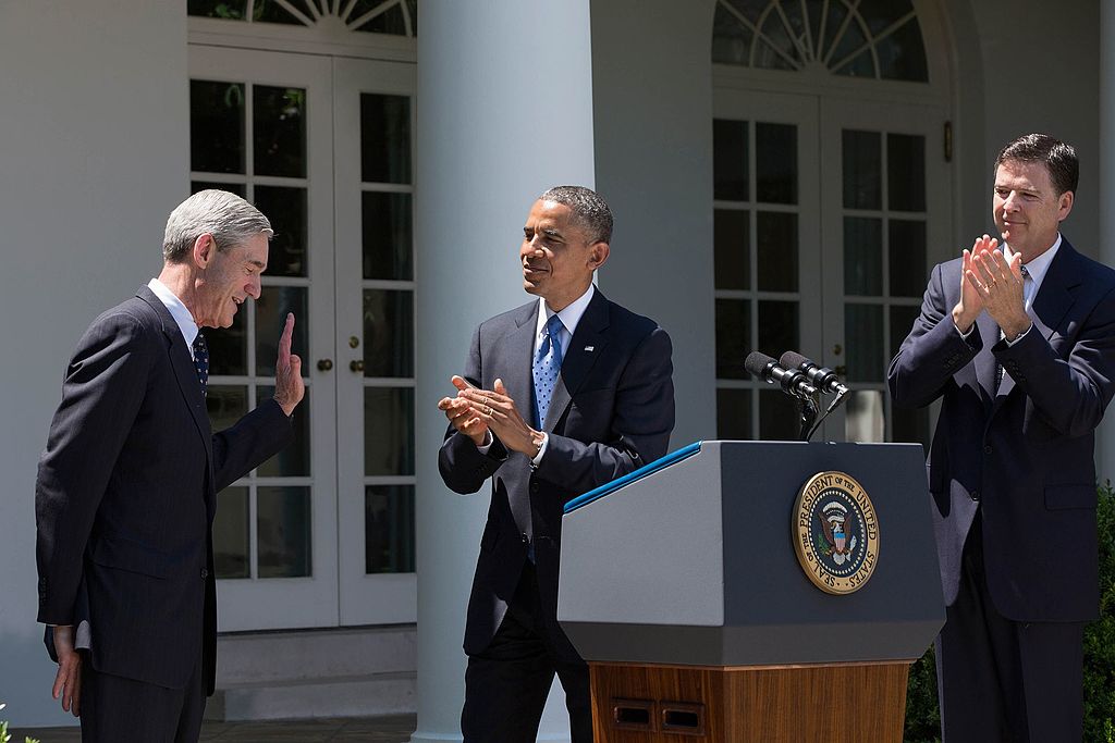 Then-FBI Director Robert Mueller, left, acknowledges applause during President Barack Obama’s remarks in the Rose Garden of the White House, June 21, 2013, announcing James Comey, right, as his nominee to succeed Mueller.