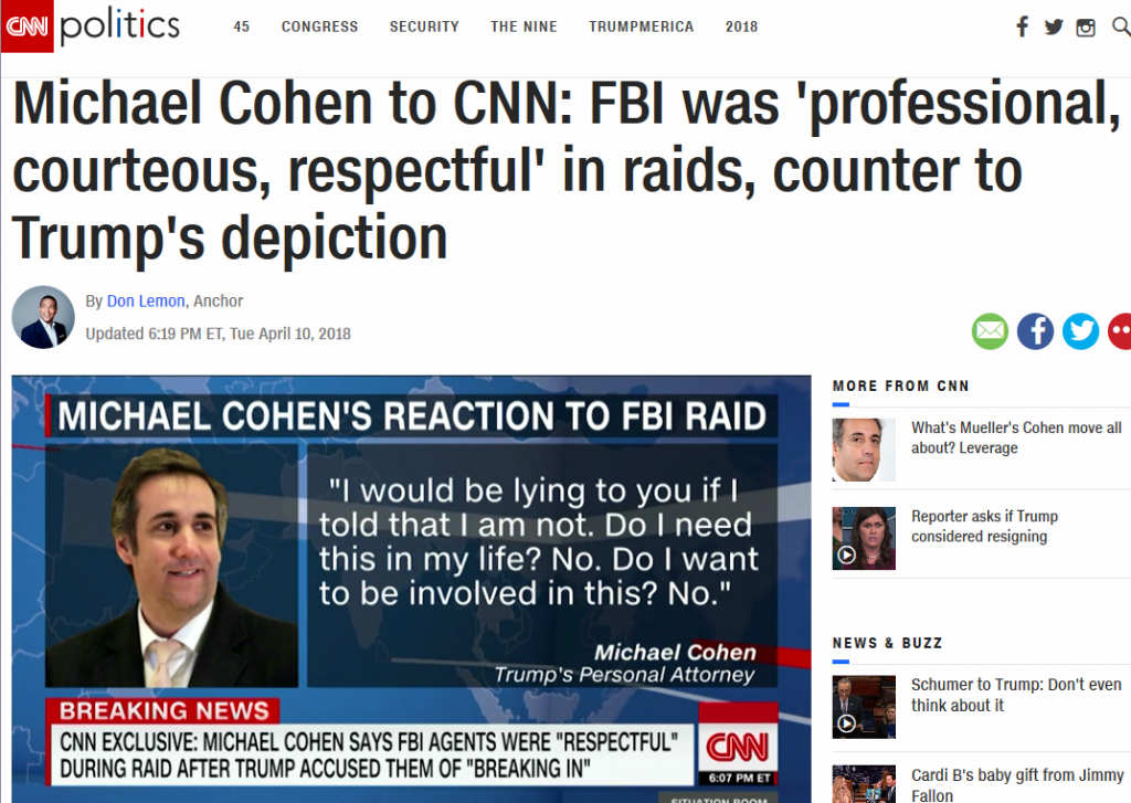 "I am unhappy to have my personal residence and office raided. But I will tell you that members of the FBI that conducted the search and seizure were all extremely professional, courteous and respectful. And I thanked them at the conclusion," Cohen said in a phone conversation on Tuesday with CNN.