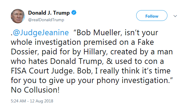 The misdirection came amid a series of searing tweets sent from his New Jersey golf club, in which he tore into two of his favourite targets, the news media and Robert Mueller's ongoing investigation into possible links between the president's campaign and Russia. Trump unleashed particular fury at reports that he was anxious about the Trump Tower meeting attended by Donald Trump Jr. and other senior campaign officials.