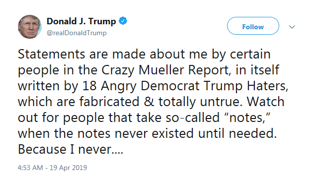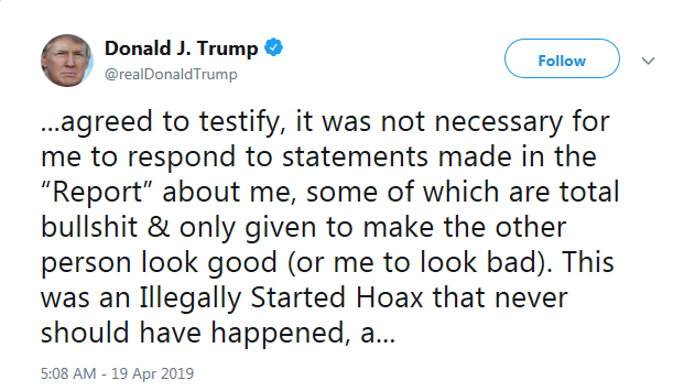 The president never sat for an interview with Mueller during the nearly two-year investigation, despite indicating on several occasions his willingness to do so. Even so, Barr said the "White House fully co-operated with the special counsel's investigation, providing unfettered access to campaign and White House documents, directing senior aides to testify freely."