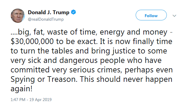 "It is clear there was no criminal wrongdoing. Nothing withheld; nothing concealed; nothing deleted; nothing destroyed; and nothing bleached," his lawyers Rudy Giuliani, Jay Sekulow, Jane Raskin and Martin Raskin said in a statement.