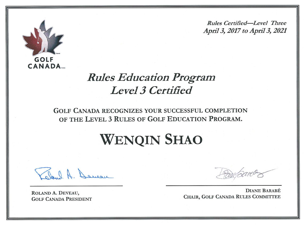 在参加了60多个小时的裁判实习以后,今年的6月底,我终于获得了加拿大高尔夫协会颁发的三级裁判证书。裁判证书的有效期为4年,到2021年4月3日为止。