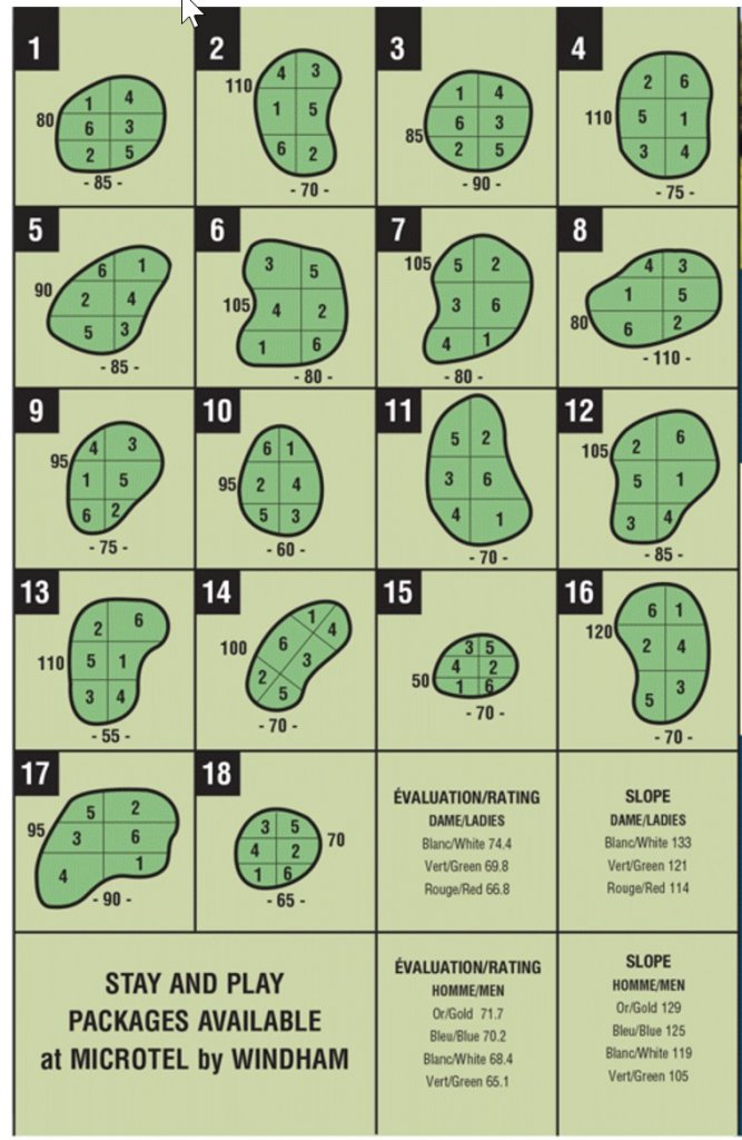 下图是Casselview球场的记分卡中每天每个球洞的位置图。 图中的数字1,表示是星期一的球洞位置;6是星期六的球洞位置。星期天的球洞位置,球场会根据当天的天气情况来确定是1-6中的那一个数字。图中球洞底部的数字表示的是球洞的宽度,侧部的数字是球洞的长度。比如,1号洞果岭的宽度是85码,长度是80码。星期一的球洞位置在果岭的左后侧。以此类推,就可得出18个果岭的球洞位置。