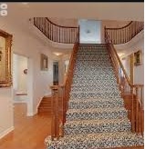 下图中,一层的房间就不加横条。二楼的主卧室,长度近50ft,又是双开门,就采用了从门中间开始 向房间两边铺,地板直接延伸到走廊。