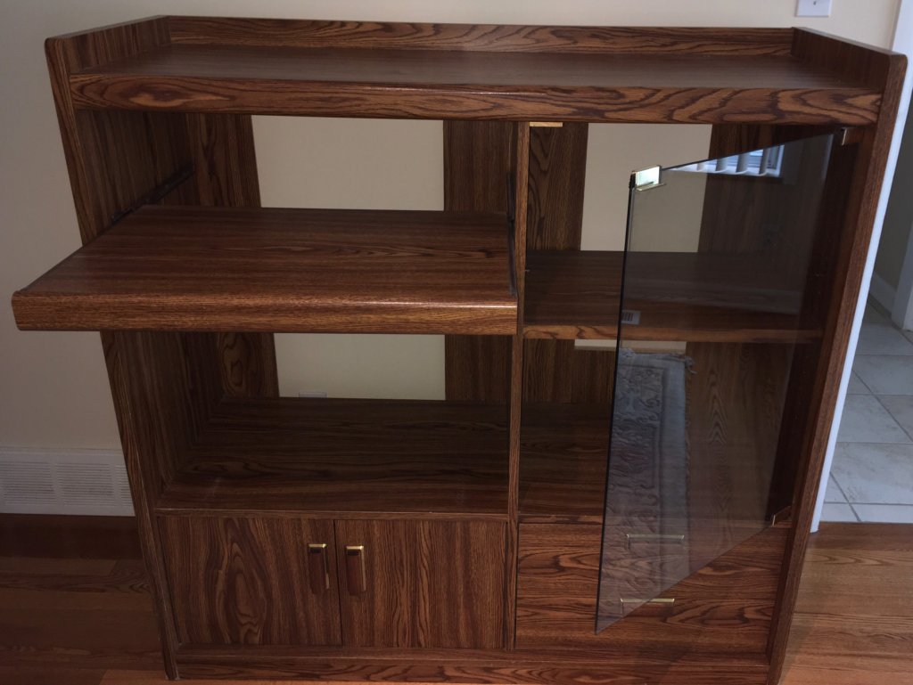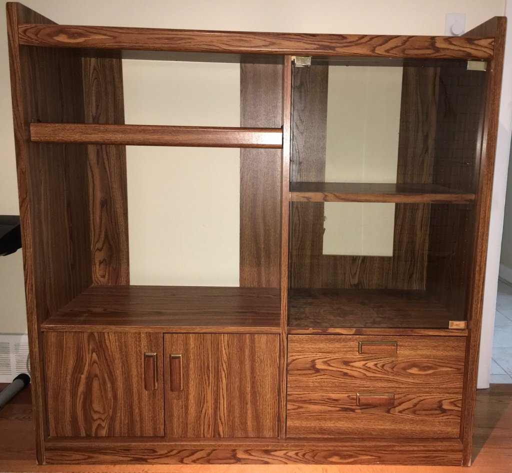 Solid wood multi-use entertainment unit for TV (32" diagonal), books, photos, decorations, etc. a glass door and pull-out shelf.