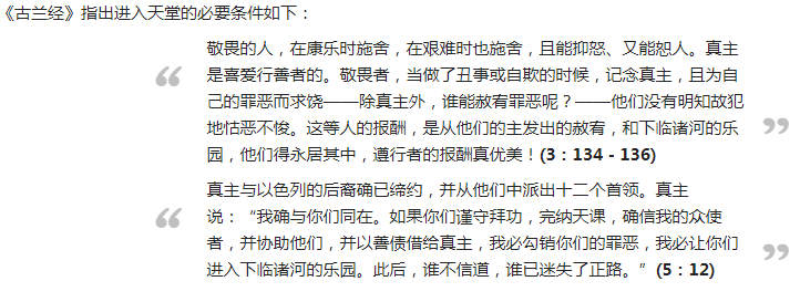uglyducking 从前有座山 VIP 注册 2003-09-30 消息 79,554 荣誉分数 23,475 声望点数 1,373 2017-10-11 #63 明的凡 说: 阿拉没有说过。 神爱世人,甚至将祂的独生子赐给他们。叫一切信祂的, 不致灭亡,反得永生。(约翰福音3:16) 点击展开... 大同小异,比你那一个信字还得外加行善,古兰经要更靠谱些。