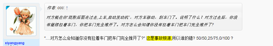 事实是这个人从他身旁经过,(开司机一侧车门,上车)。楼主是知道这个人上车要离开的。车门是没有和对方的车接触的。对方的车是前进直线离开,只有楼主突然打开车门并且接触到了对方的情况下,才会造成这样的结果。假如对方车没有动,楼主的动作至少会把对方的汽车造成chip.
