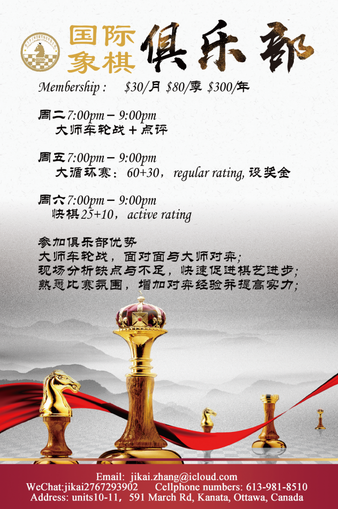 1. Kanata Chess Club正式成立啦!每周二,周五,周六晚上国家大师级别坐镇车轮战,面对面与大师对弈,对局结束后分析缺点与不足。模拟比赛模式的championship以及快棋赛,熟悉比赛氛围,增加对弈经验提高实力。欢迎大家联系微信:jikai2767293902手机:6139818510