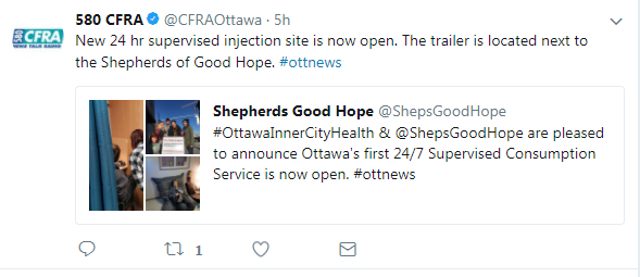 Ottawa Inner City Health wants to start an injection site at the Shepherds of Good Hope on King Edward Avenue. The Somerset West Community Health Centre on Eccles Street also applied for an injection site. Those applications are still listed as incomplete by Health Canada.