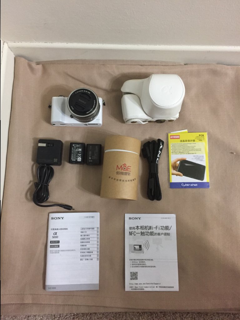 索尼α5000,快门数小于100,非常新,两块电池,充电器,8g存储卡,相机包,包带,说明书等。150刀