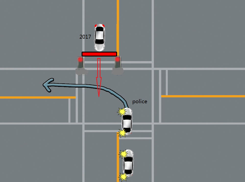 Teddy 说: 其实,这个警车在反向,咋么可以看到这边闯红灯?不过是依据他看到自己的灯,推测对方灯的情况,所以不是严格的看到。 点击展开... 看你这么说,我又回去看了看(我先前没仔细看,理解有误)。我笑喷了! 黄哥他还能再弱一点儿么!? 2017 说: 警察等左转, 哥黄灯直行没让他, 丫诬陷哥闯红灯, 罚款扣三分 .... 点击展开... 借用个图改一改,是这个意思: 楼主输定了!