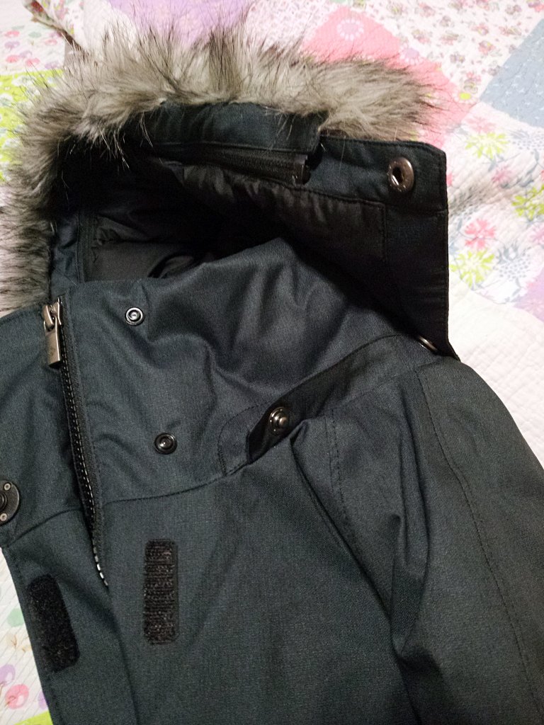 深灰色修身款,S码(160-165),我160cm不胖不瘦,穿起来合适,里面还有一点空间,长度及膝,防风防水防雪,只穿过一次,跟新的一样,重点是非常的暖和,适合在加拿大这样的冬天穿。