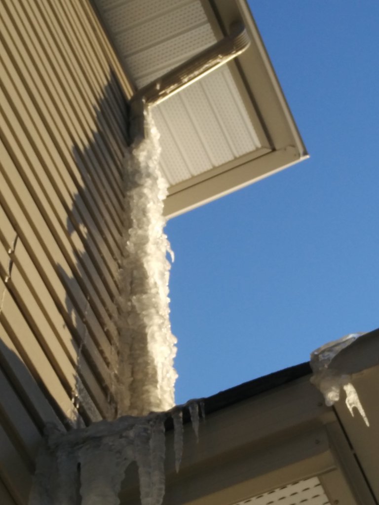 Can anyone tell me the reason for the ice accumulated outside of the gutter? This section of the gutter is located between the roofs of second floor and garage. I am sure no blockage from fallen leaves as it was installed in last winter for a brand new house. Same issue happened in last winter too.