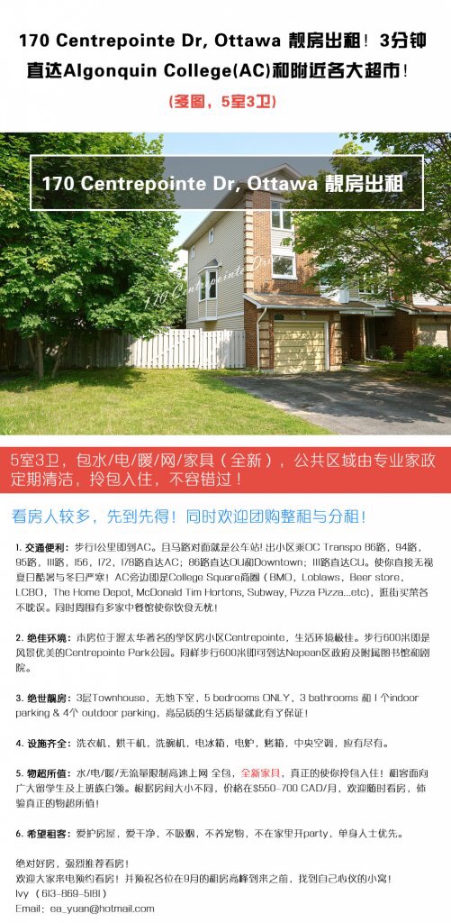 三楼卧室A招长租,三月起租。Centrepointe的house,招租男生,距离algonquin坐公车五分钟,附近有crispy,new hong kong,室友是四个男生。均是Algonquin学生。详情请联系电话+1 (343) 988-8734,微信cy_99616