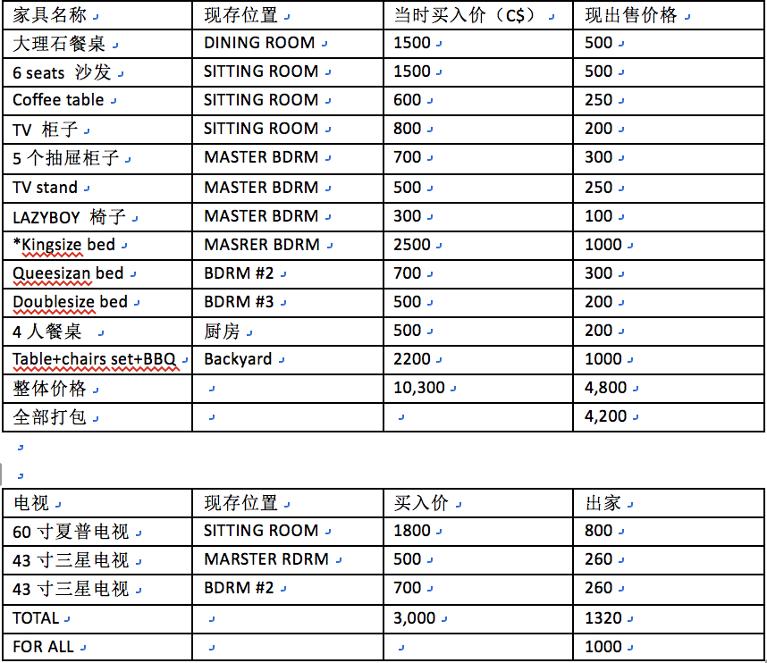 大家可以从下面的家具价格单上找到对应的家具照片,家具都保养都非常好,