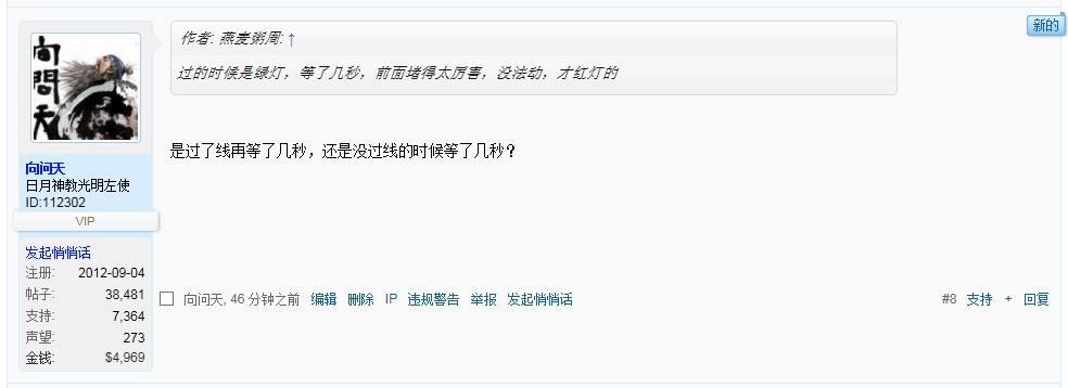 当时是绿灯,前方比较堵,车子已经排到接近交通灯下了,我犹豫了一下,还是继续向前,停在了交通灯下,结果就红灯