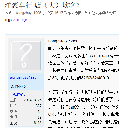 ,我把cap没了,气没充好什么什么的,告诉老板,那人一直说OK。OK。OK。说到他们扒胎的时候,老板听说我去问过别人了,可牛逼的来了句极其标准的普通话:‘哪家店啊?我这轮胎的设备就买了15万’。我把胎拿出来给他看的时候 昨天被割掉的那块从袋子里还掉出来了。。