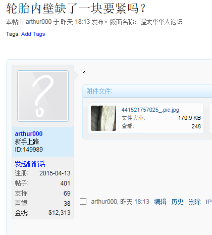 今天到了车行,让老板跟换胎的出来,结果昨天还是洋葱老板亲自给我换的胎。去之前我还在家旁边的卖轮胎的看了下,人家一看就是说,扒胎机没用好。到了之后,我把cap没了,气没充好什么什么的,告诉老板,那人一直说OK。OK。OK。说到他们扒胎的时候,老板听说我去问过别人了,可牛逼的来了句极其标准的普通话:‘哪家店啊?我这轮胎的设备就买了15万’。我把胎拿出来给他看的时候 昨天被割掉的那块从袋子里还掉出来了。。