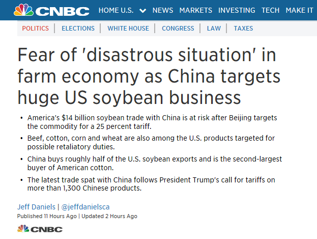 此前,美方宣布将对中国对美出口的商品大规模征税,税率高达25%,且涉及征税的中国商品规模将达600亿美元。自此之后,美国农业界就密切注视中方的反制措施,其中最焦虑的就是大豆生产商。