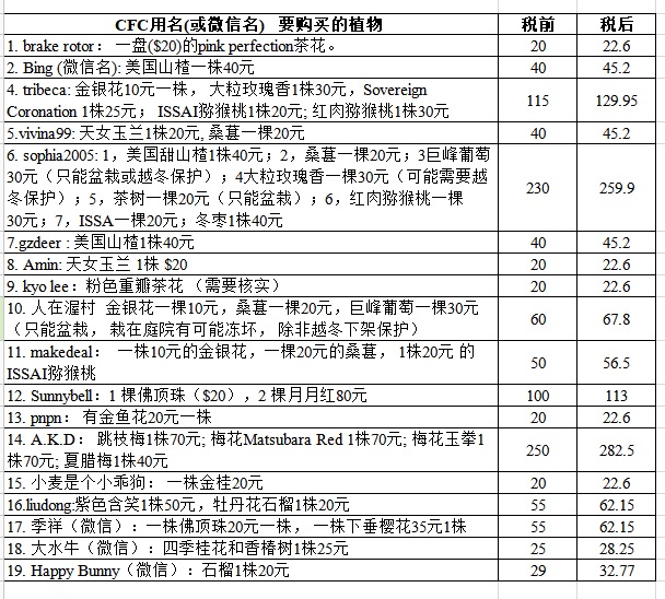 到目前为止报名购买植物的朋友,什么地方有错误的话, 请更正或更改想购买是植物。这次购买截止日期是4月30日。费用计算如下:总费用 = 植物费用+13%HST。为了感谢大家对我生意的支持, 这次团购的包装邮寄费用由我来出(也就免除邮费)。如果确定购买,请通过Email汇款。汇款时请输入email (pingding2017@gmail.com),收款人可输入:Kevin Plants。 汇款时需要设置安全问题与答案。请将安全问题的答案发到这个email (chinesetoon@gmail.com)。 请在汇款和发给我安全问题答案的email中,注明你的CFC用名或微信名。植物会邮寄到张先生那里, 寄出植物的时间是5月初。