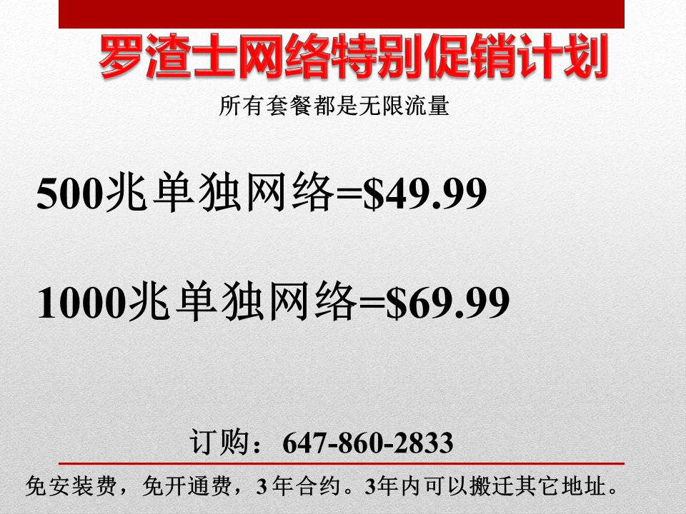 罗渣士网络特别优惠500兆49.99,2年合约,送50,1500兆64.99送50,1500+电视74.99 送150