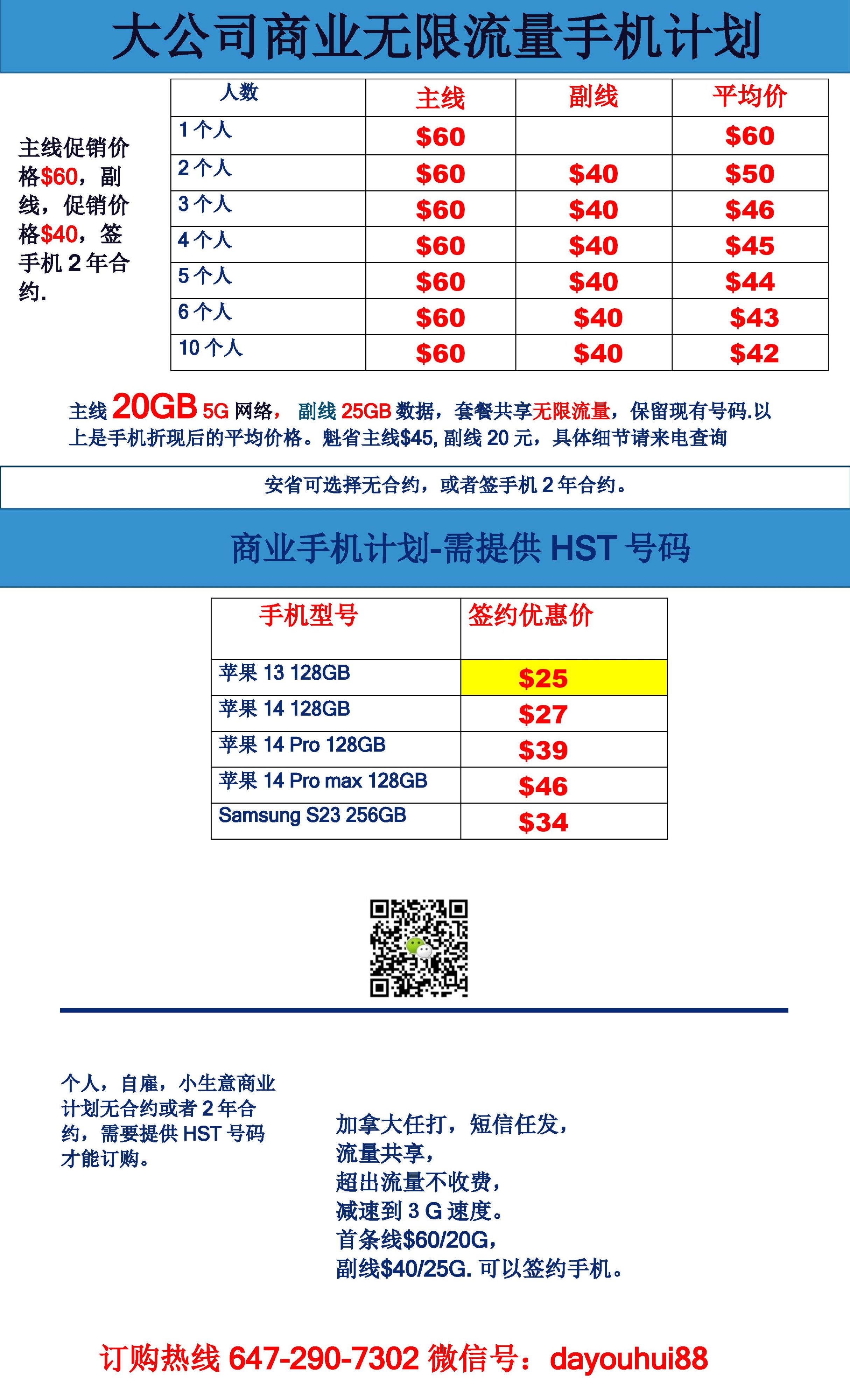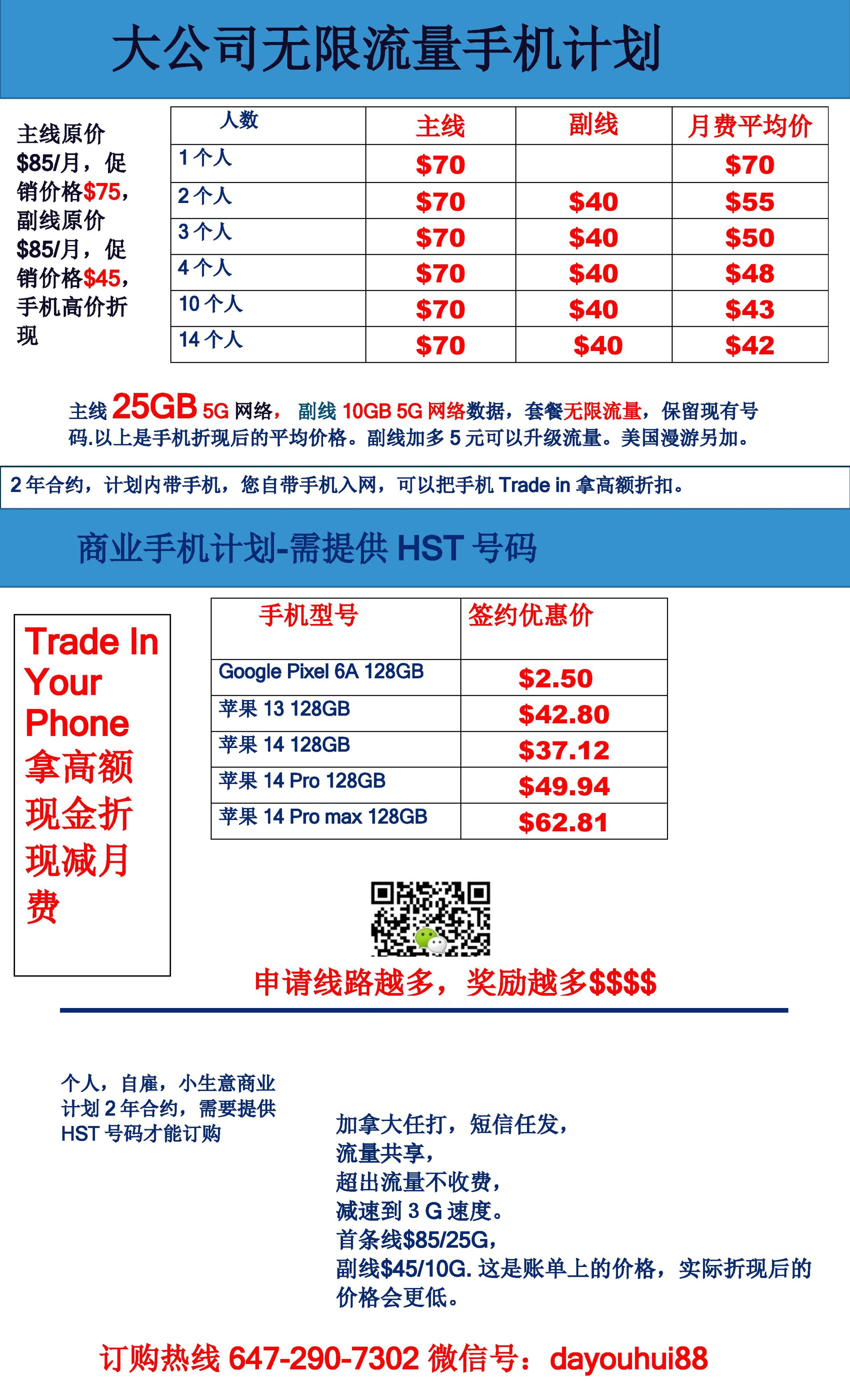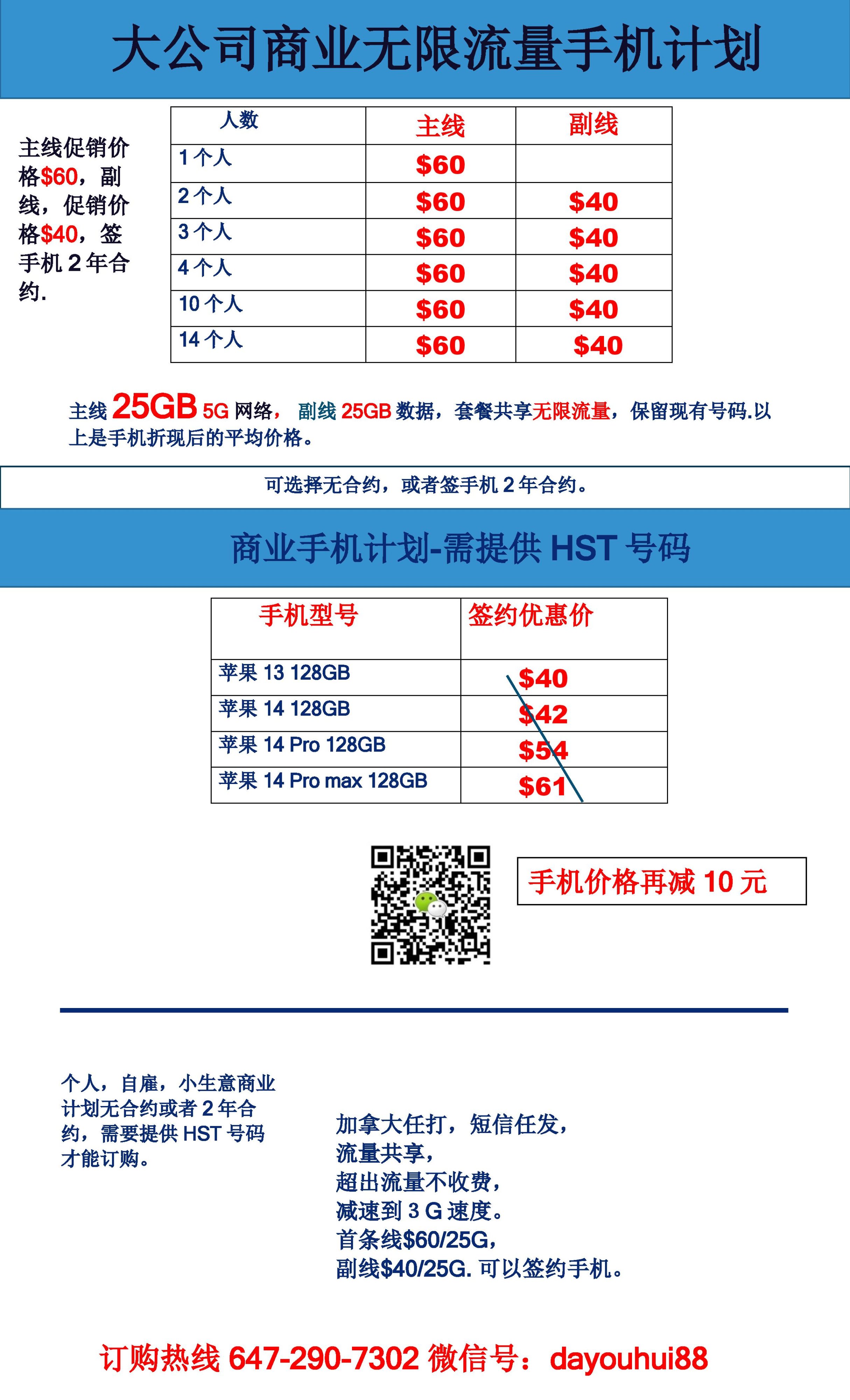 商业手机计划,须提供商业注册号码。有商业网络的请来电查询是否可以申请特殊商业手机计划$35/50GB 大公司计划,需要提供商业号码或者HST号码。