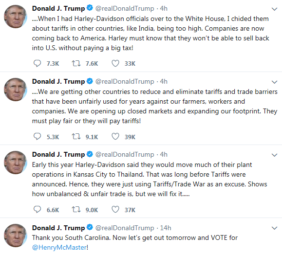 This is a potential game changer in Trump’s trade strategy, especially if it marks the start of more companies announcing layoffs. On Monday, Harley-Davidson said it will be moving some “production” offshore because of the trade war (Europe hit Harley with a 31 percent tariff in response to Trump’s steel tariffs on Europe). Harley won’t confirm whether jobs are leaving the United States, but the union representing many Harley workers, the International Association of Machinists and Aerospace Workers, is worried.