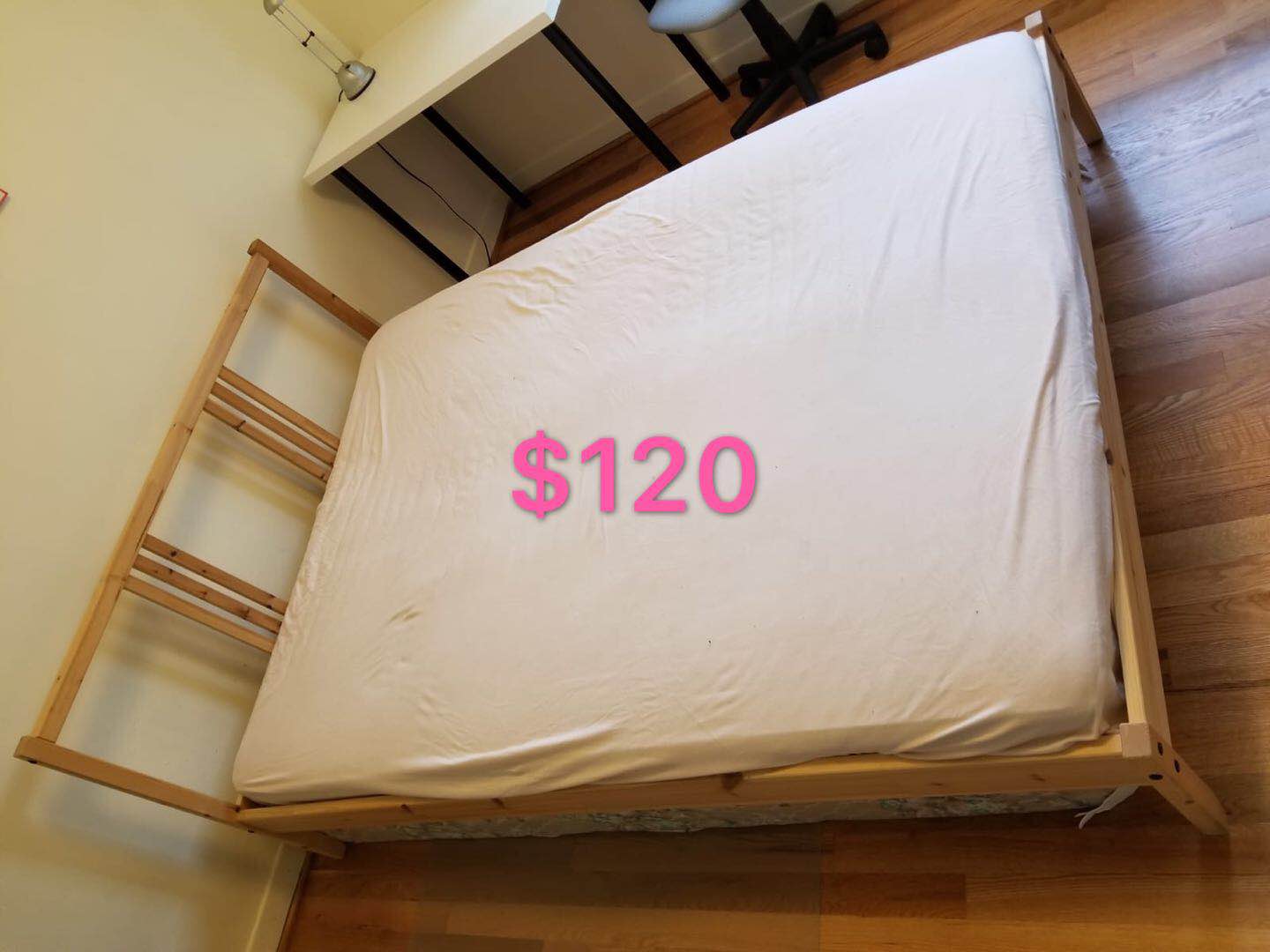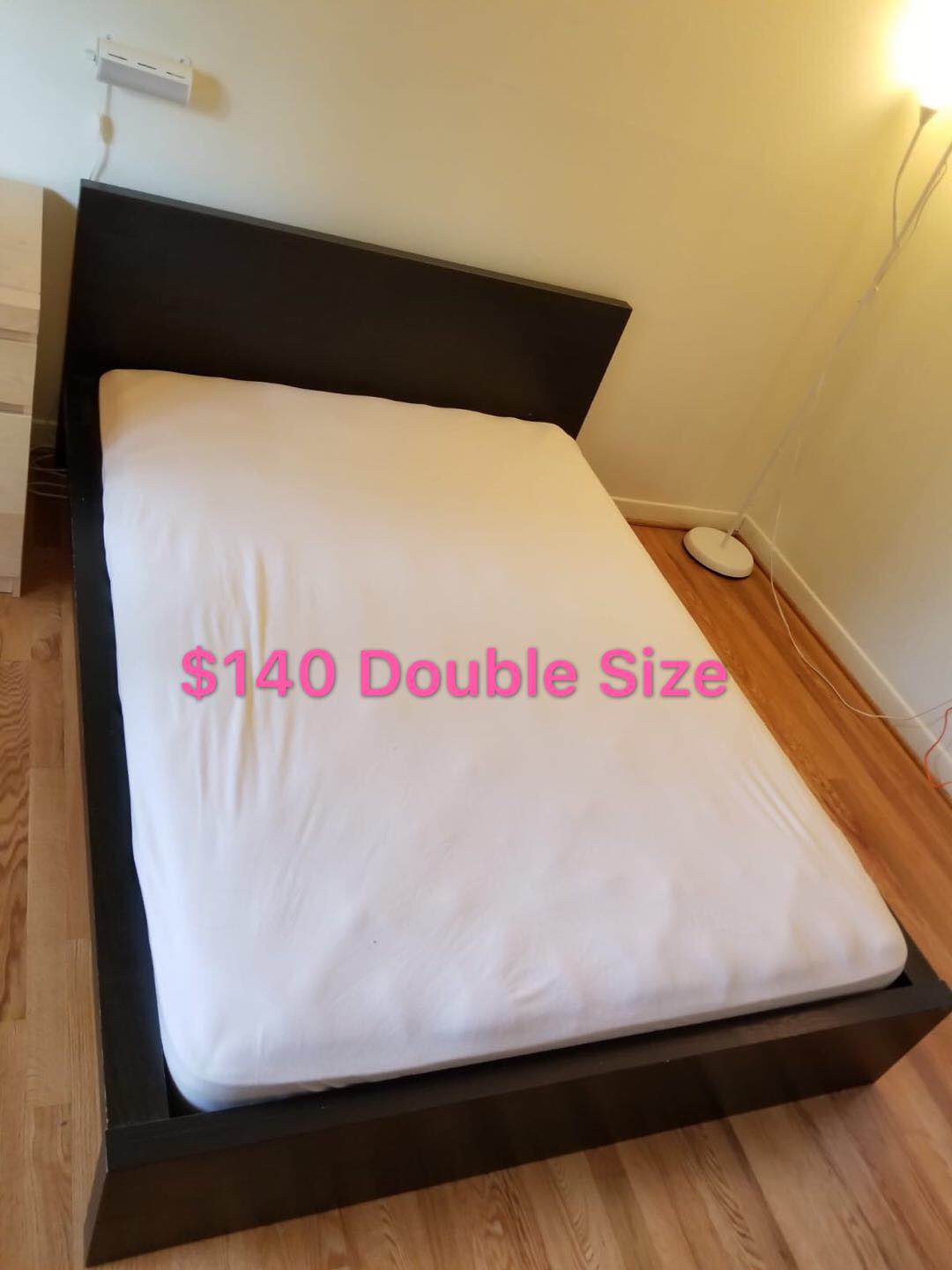 Selling all furnitures including 4 double beds 1 queen bed and 1 single bed (price includes frame and mattress) ; dining table, bookshelf and more.