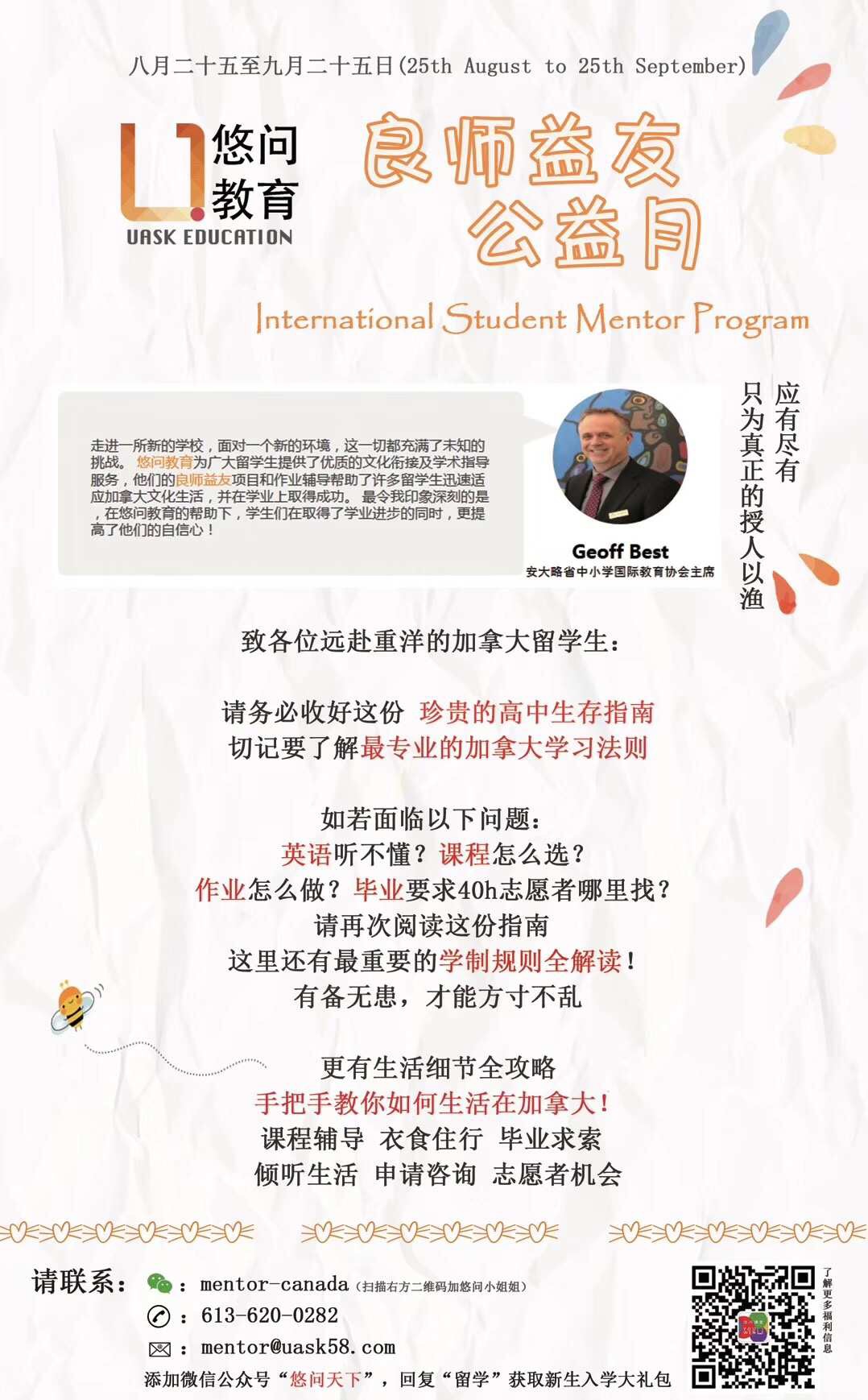 自成立伊始,悠问秉承“爱不缺席,教育不敷衍”的理念,先后与渥太华卡尔顿教育局(OCDSB)、加拿大大学协会(Universities Canada)、加拿大应用技术与职业学院协会(Colleges and Institues Canada)、渥太华大学、亚冈昆学院、乔治亚学院以及多伦多大学、麦吉尔大学、UBC中国学生学者联谊会(CSSA)等教育机构和协会建立了合作伙伴关系,是渥太华卡尔顿教育局(OCDSB)唯一推荐课程机构,Pragon考试中心在渥太华官方唯一认证培训机构。