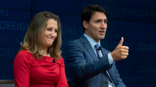Prime Minister Justin Trudeau and Minister of Foreign Affairs Chrystia Freeland walk to a press conference on the USMCA trade deal on Parliament Hill in Ottawa on Oct. 1. (Justin Tang / THE CANADIAN PRESS)